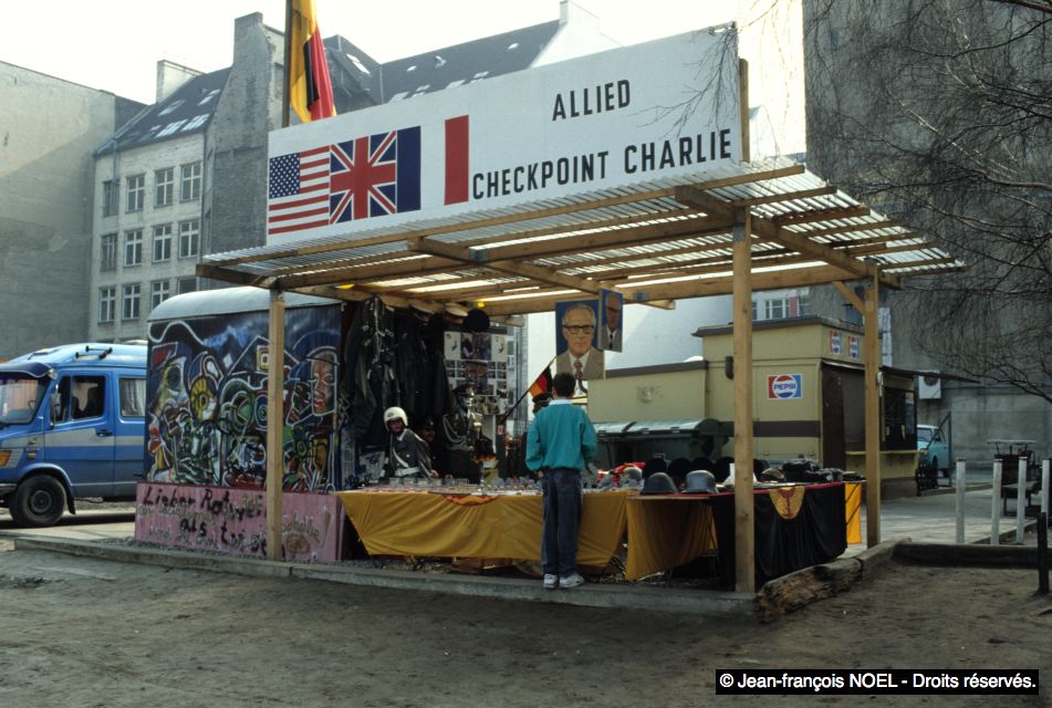 Mars 1991, Berlin Ouest, Friedrichstrasse.Des baraques américaines de Checkpoint Charlie, il ne reste que l'enseigne.
