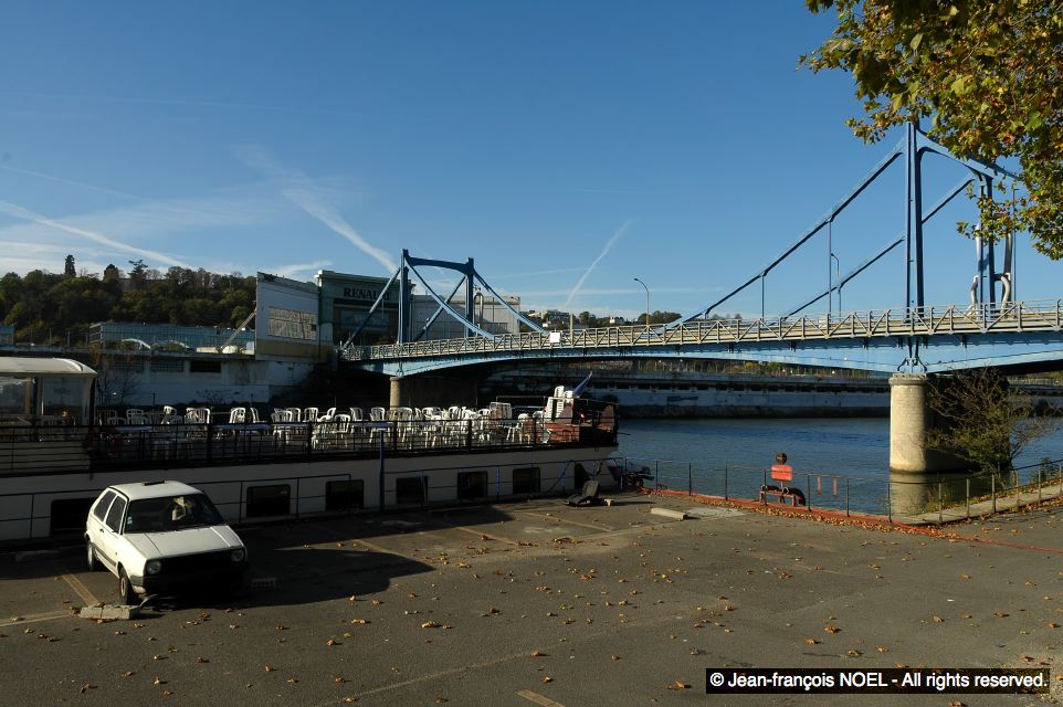 Quai de Stalingrad. Bateau restaurant-dancing au pied du pont entre les ateliers de Billancourt et l'Ile Seguin.